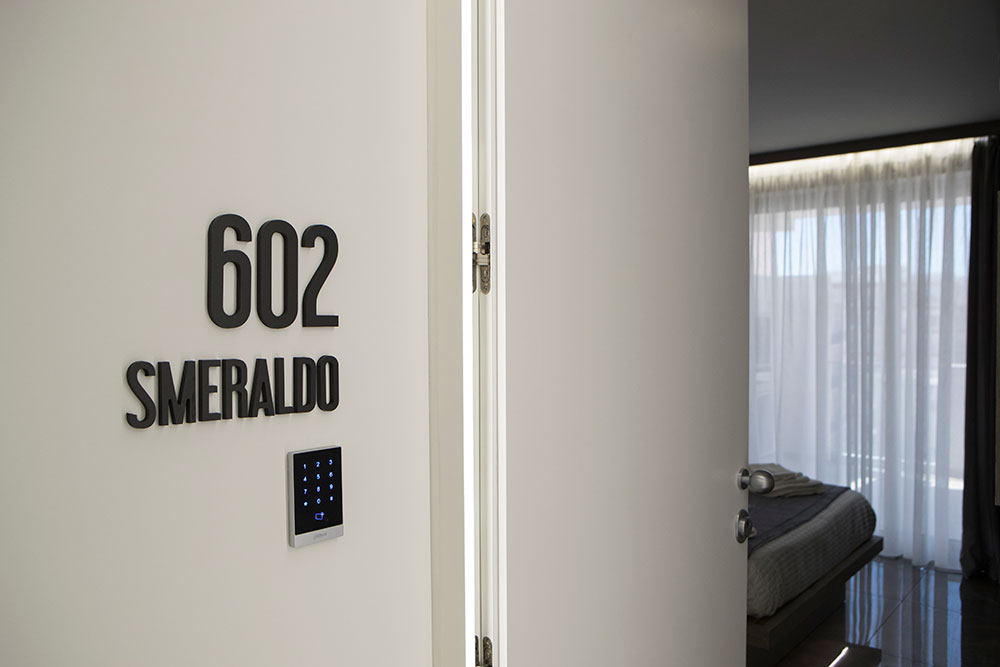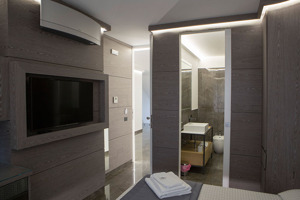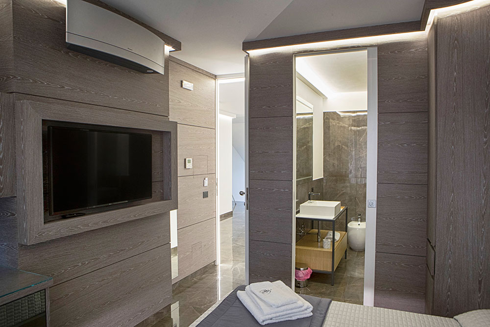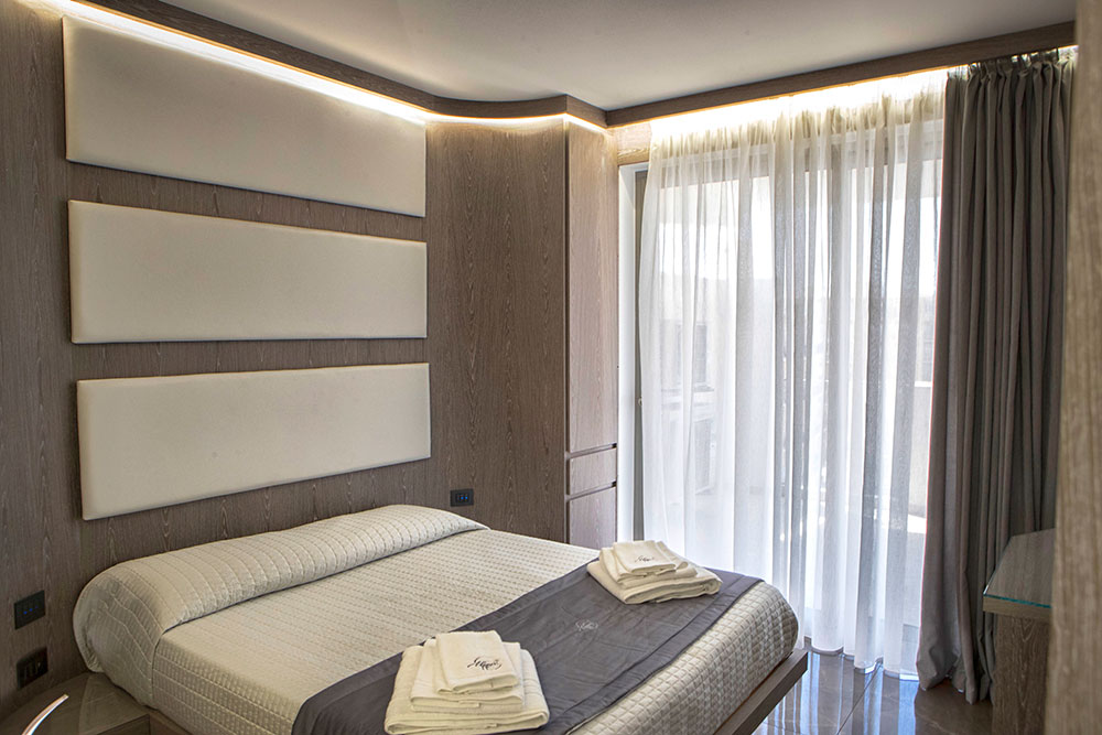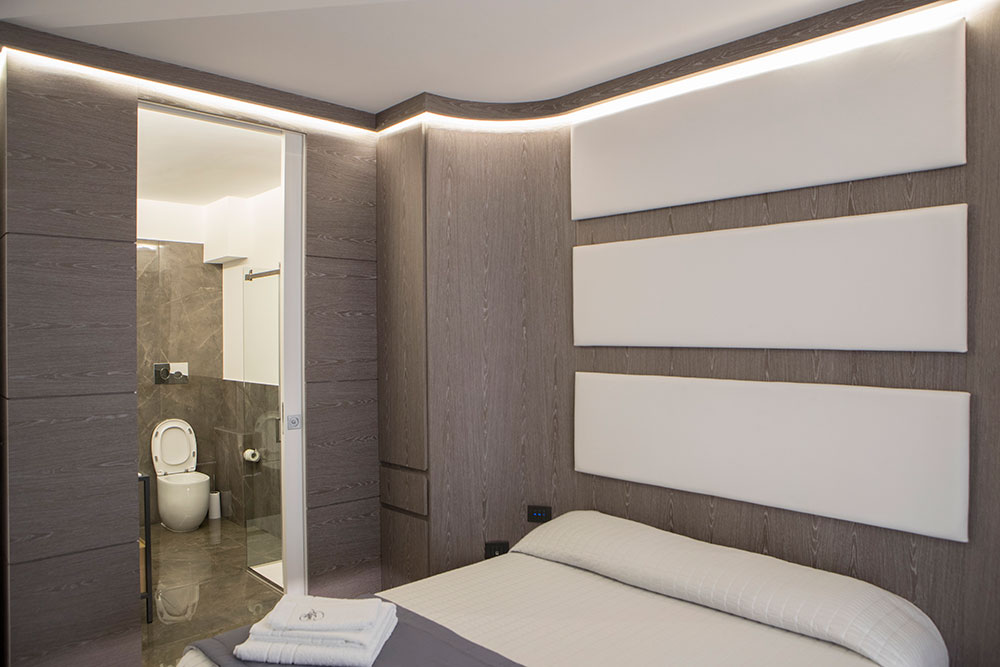 Smeraldo offre un atmosfera fresca con le sue pareti rivestite in legno nei colori del grigio , la testata del letto rivestita con pelle bianca , rimanda allo stile nautico , ampie vetrate illuminano la stanza .